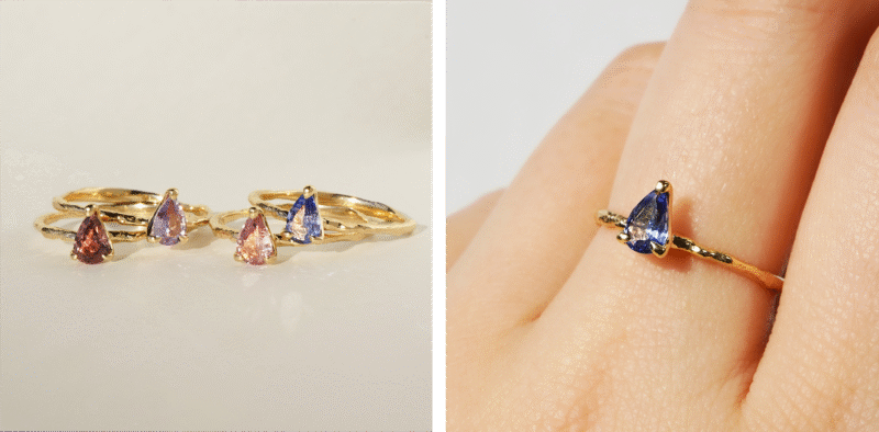 透明感のある光が指先でゆらめく、ペアシェイプにカットされたサファイア。