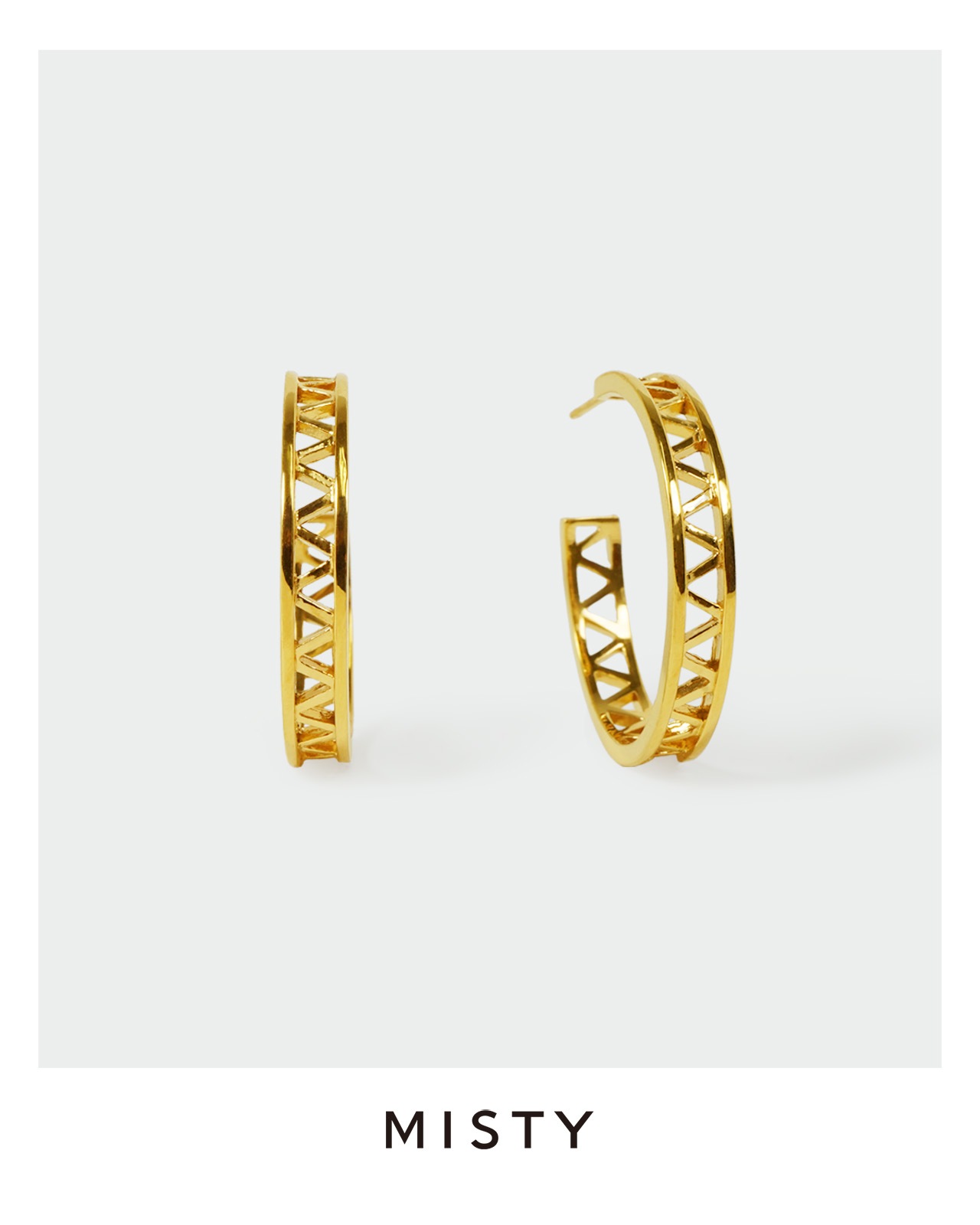 シンプルながらもグラフィカルな透かし模様が際立つ、洗練された佇まいのビッグフープピアス。顔まわりの程よいアクセントとなり、装いにこなれ感をプラスしてくれます。凛とした美しさと知性を感じさせるデザインは、日常から特別なシーンまで、あらゆるスタイルに品よく寄り添います。 店頭在庫については、MISTY各店舗にお問い合わせください。