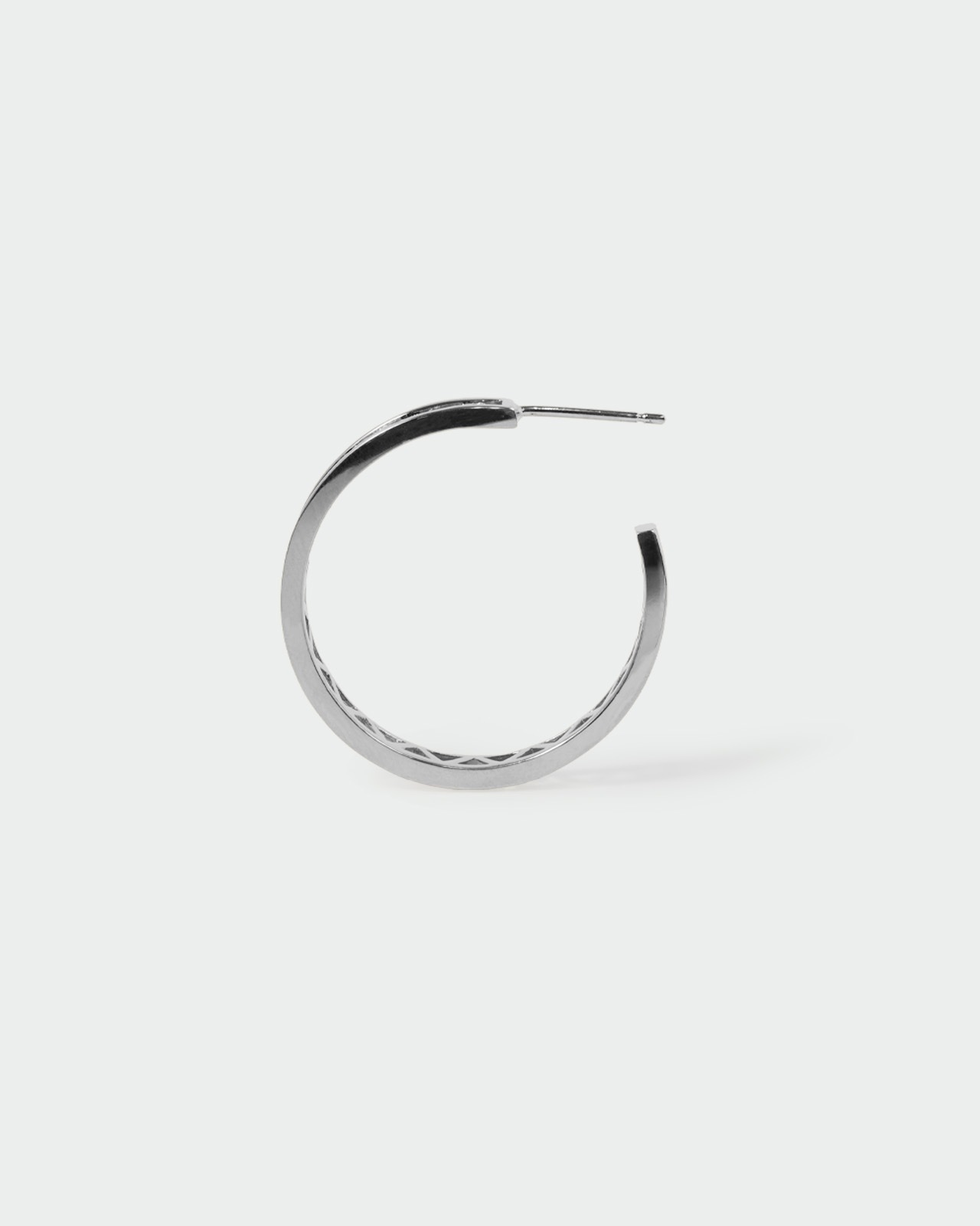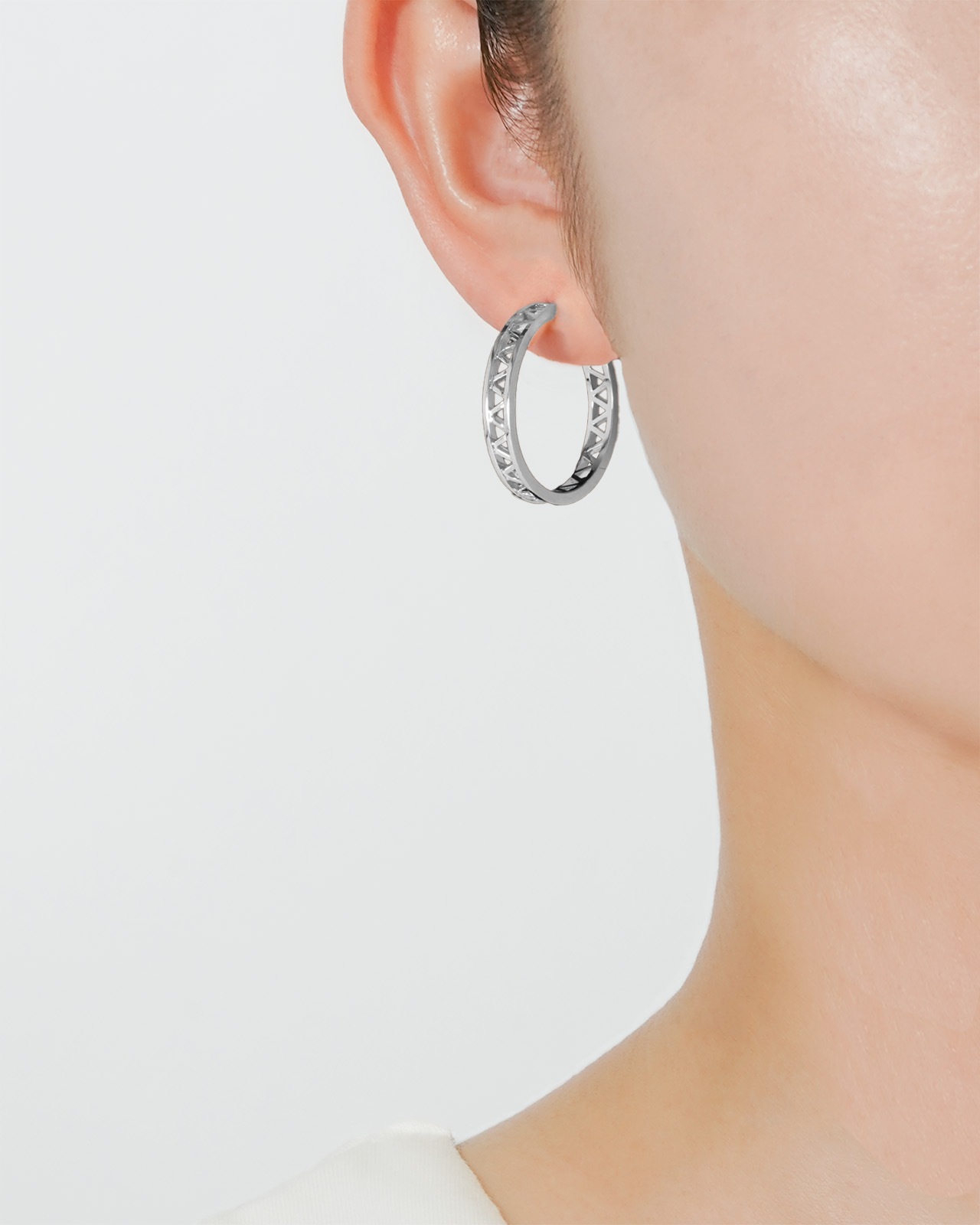 シンプルながらもグラフィカルな透かし模様が際立つ、洗練された佇まいのビッグフープピアス。顔まわりの程よいアクセントとなり、装いにこなれ感をプラスしてくれます。凛とした美しさと知性を感じさせるデザインは、日常から特別なシーンまで、あらゆるスタイルに品よく寄り添います。 店頭在庫については、MISTY各店舗にお問い合わせください。
